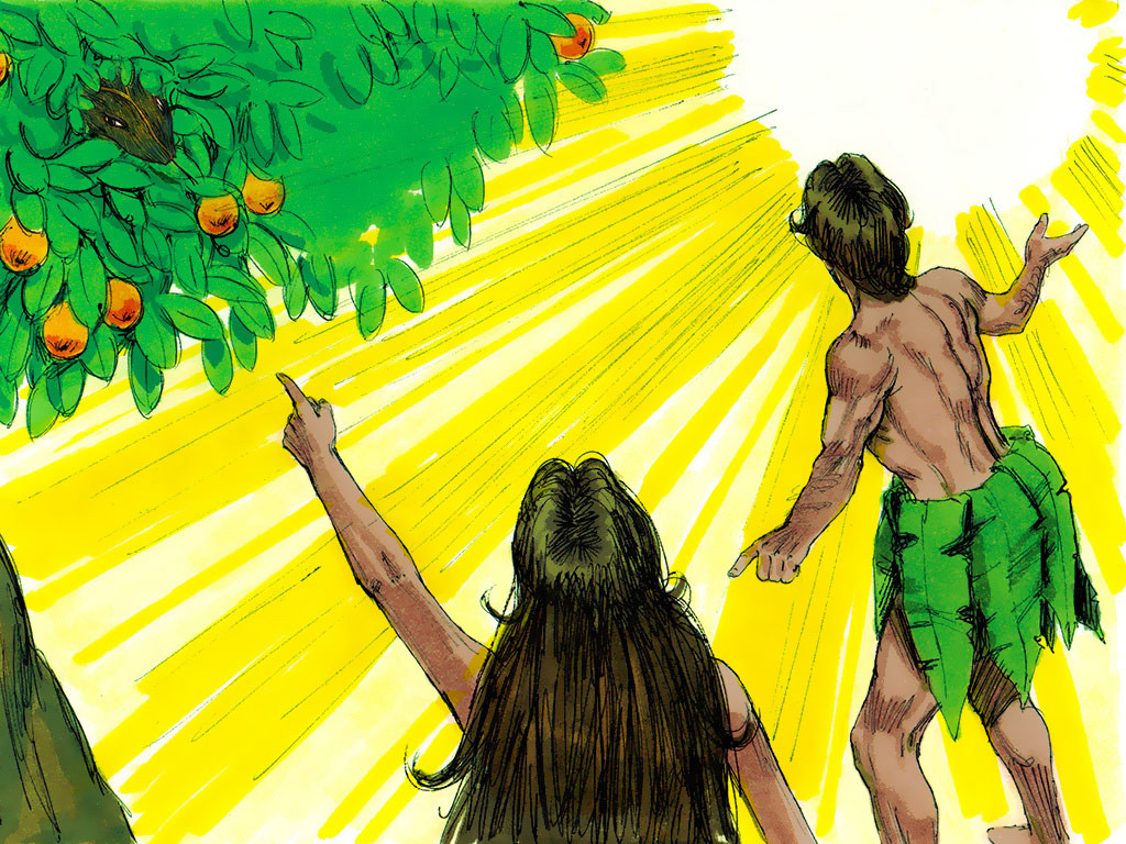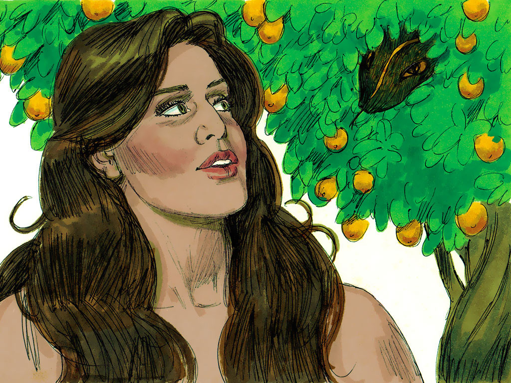 Drawings (c) Free Bible Images, used by permission.1 Now the serpent was more crafty than any of the animals the Lord God had made. He said to the woman, “Did God really say, ‘You must not eat from any tree in the garden’?”2 The woman said to the serpent, “We may eat fruit from the trees in the garden, 3 but God did say, ‘You must not eat fruit from the tree that is in the middle of the garden, and you must not touch it, or you will die.’”4 “You will most certainly not die,” the serpent said to the woman. 5 “For God knows that when you eat from it, your eyes will be opened, and you will be like God, knowing good and evil.”6 When the woman saw that the fruit of the tree was good for food and pleasing to the eye, and also desirable for gaining wisdom, she took some and ate it.She also gave some to her husband, who was with her, and he ate it. 7 Then the eyes of both of them were opened, and they realized they were naked; so they sewed fig leaves together and made coverings for themselves.8 Then the man and his wife heard the sound of the Lord God as he was walking in the garden in the cool of the day, and they hid from the Lord God among the trees of the garden. 9 But the Lord God called to the man saying, “Where are you?”10 Adam answered, “I heard You in the garden, and I was afraid because I was naked; so I hid.” 11 And the Lord God said, “Who told you that you were naked? Have you eaten from the tree that I commanded you not to eat from?”12 The man said, “The woman you put here with me—she gave me some fruit from the tree, and I ate it.” 13 Then the Lord God said to the woman, “What is this you have done?” The woman said, “The serpent deceived me, and I ate.”14 So the Lord God said to the serpent, “Because you have done this, cursed are you above all livestock and all wild animals! You will crawl on your belly and you will eat dust all the days of your life. 15 And I will put enmity between you and the woman, and between your offspring and hers; He will crush your head, and you will strike His heel.”16 To the woman he said, “I will make your pains in childbearing very severe; with painful labor you will give birth to children. (And the curses continued on from there.)The Apostle John wrote in 1 John 2:15-17 that we are under a three-pronged attack: when it comes to temptation: