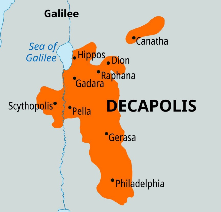 * Decapolis, “The Ten Cities,” were Helenistic (Greek culture) cities mostly east of the Jordan River and Galillean Sea. The 10th city, not pictured, was Syrian Damascus.